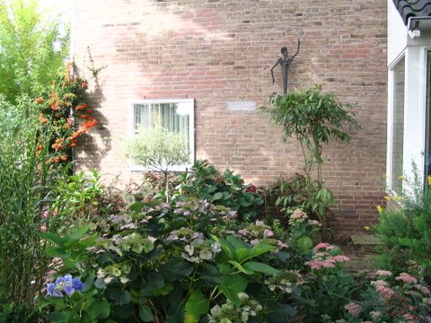Stroeslaan 8 (hoek Ten Boomstraat), Hilversum.Gevelsteen en beeldje.